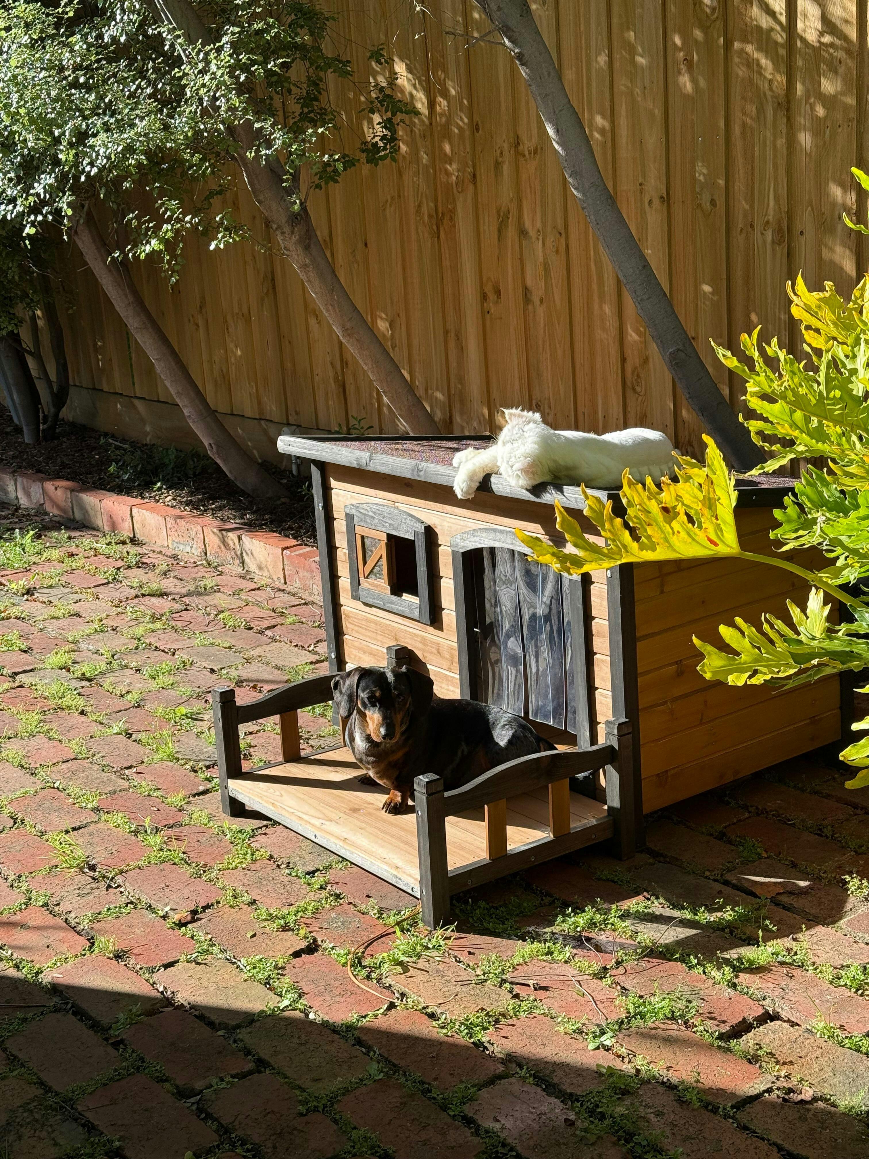 - Optional matching mats, verandah, storage boxes and raised food bowls.