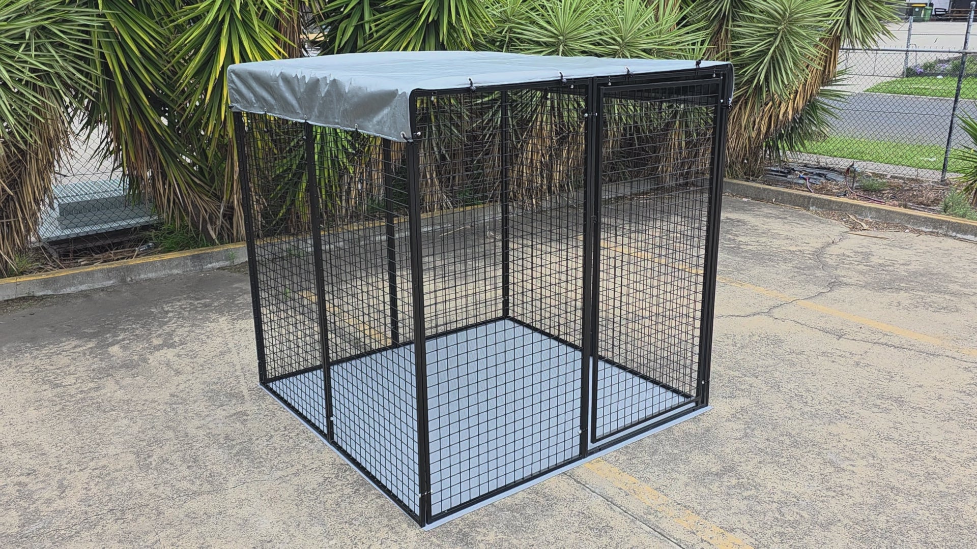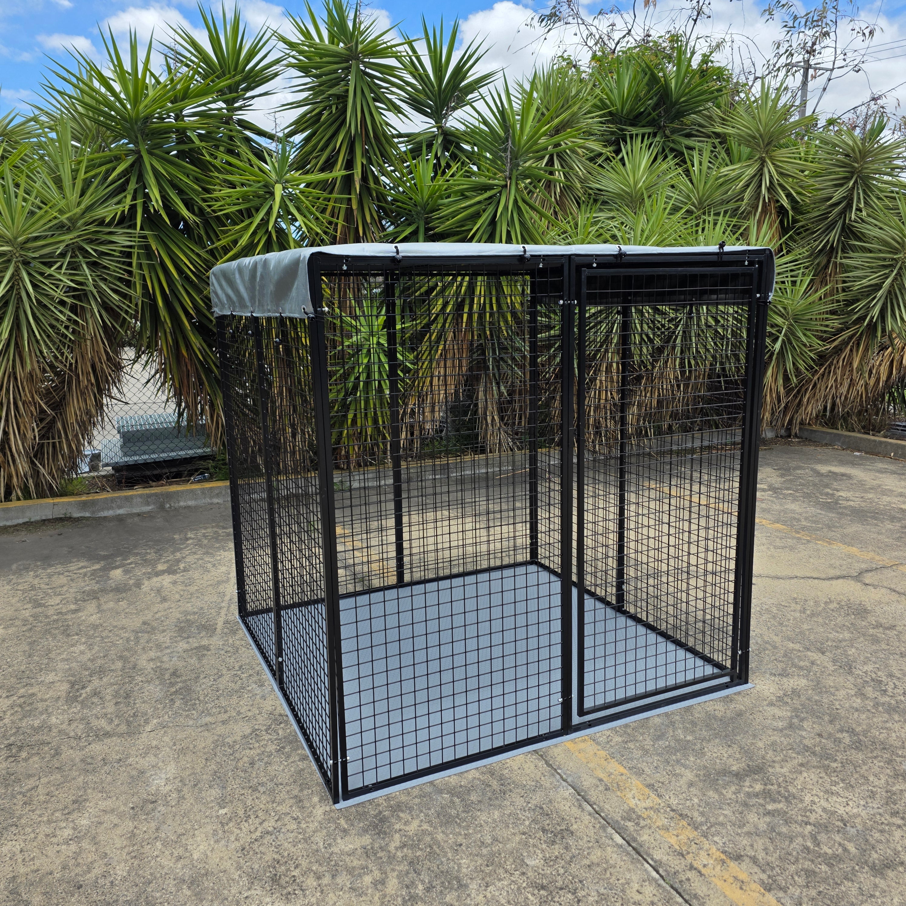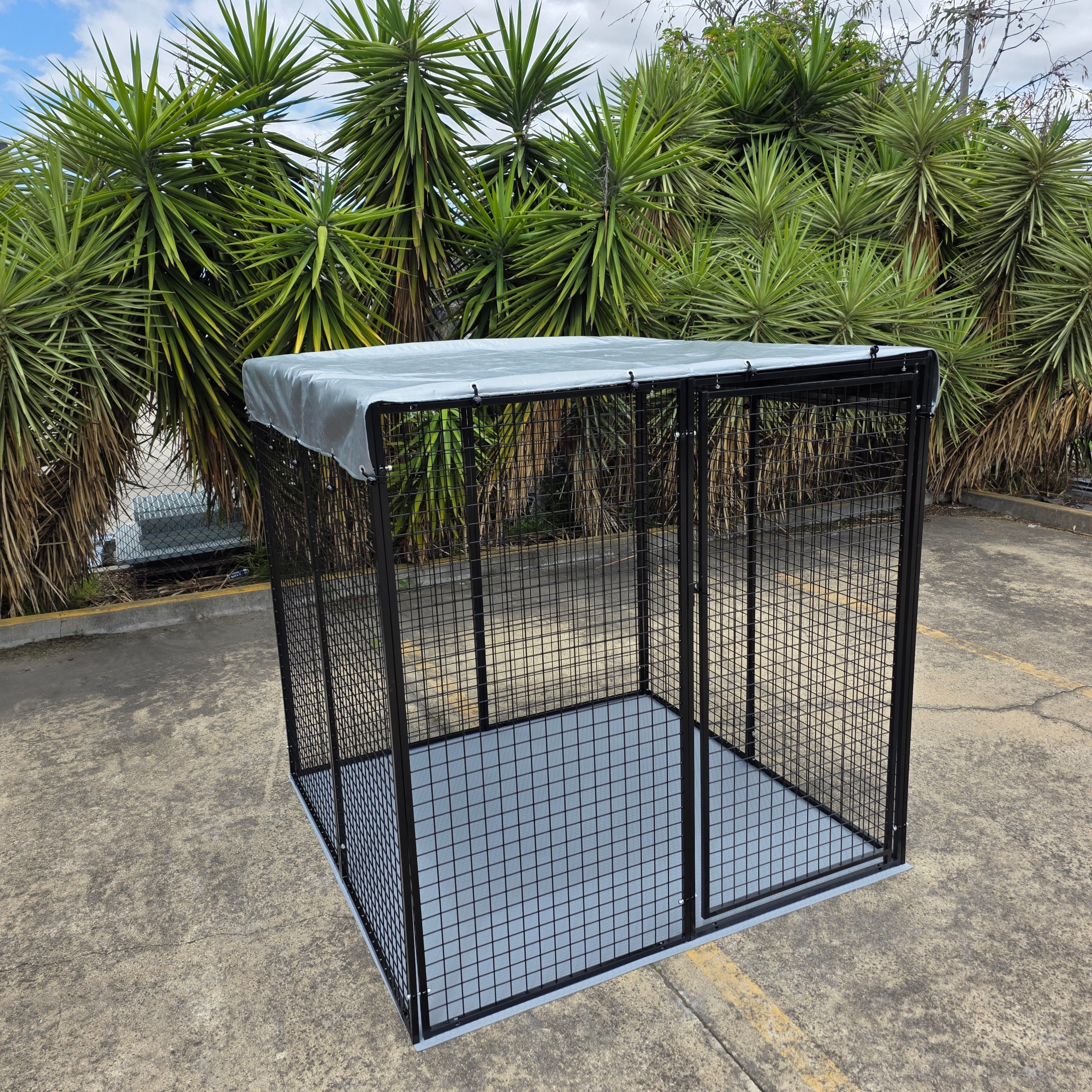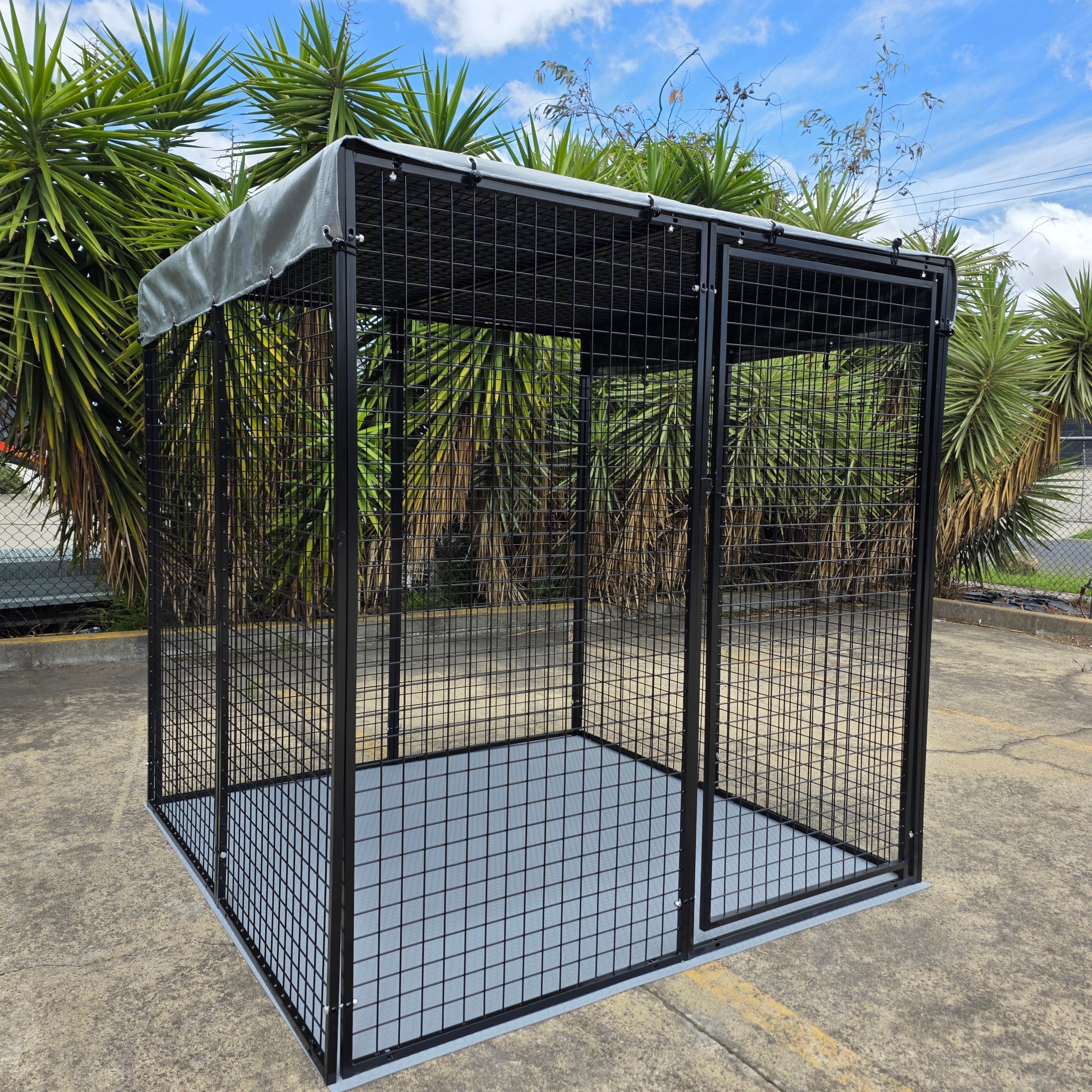 10 super heavy-duty panels comply with local council / government pet cat dog / dangerous dog enclosure kennel requirements. 3mm thick PVC floor mat is included. Heavyduty roof tarp cover is included. Pet enclosure / playpen can be made bigger to 10+ square metres by adding additional panels and floor mats. Pet pen run features heavy duty strong galvanised steel frame. Pen can be attached to a house wall or a fence to use it as dog fencing. Panels are galvanised and powder coated for longevity, durability and rust protection.